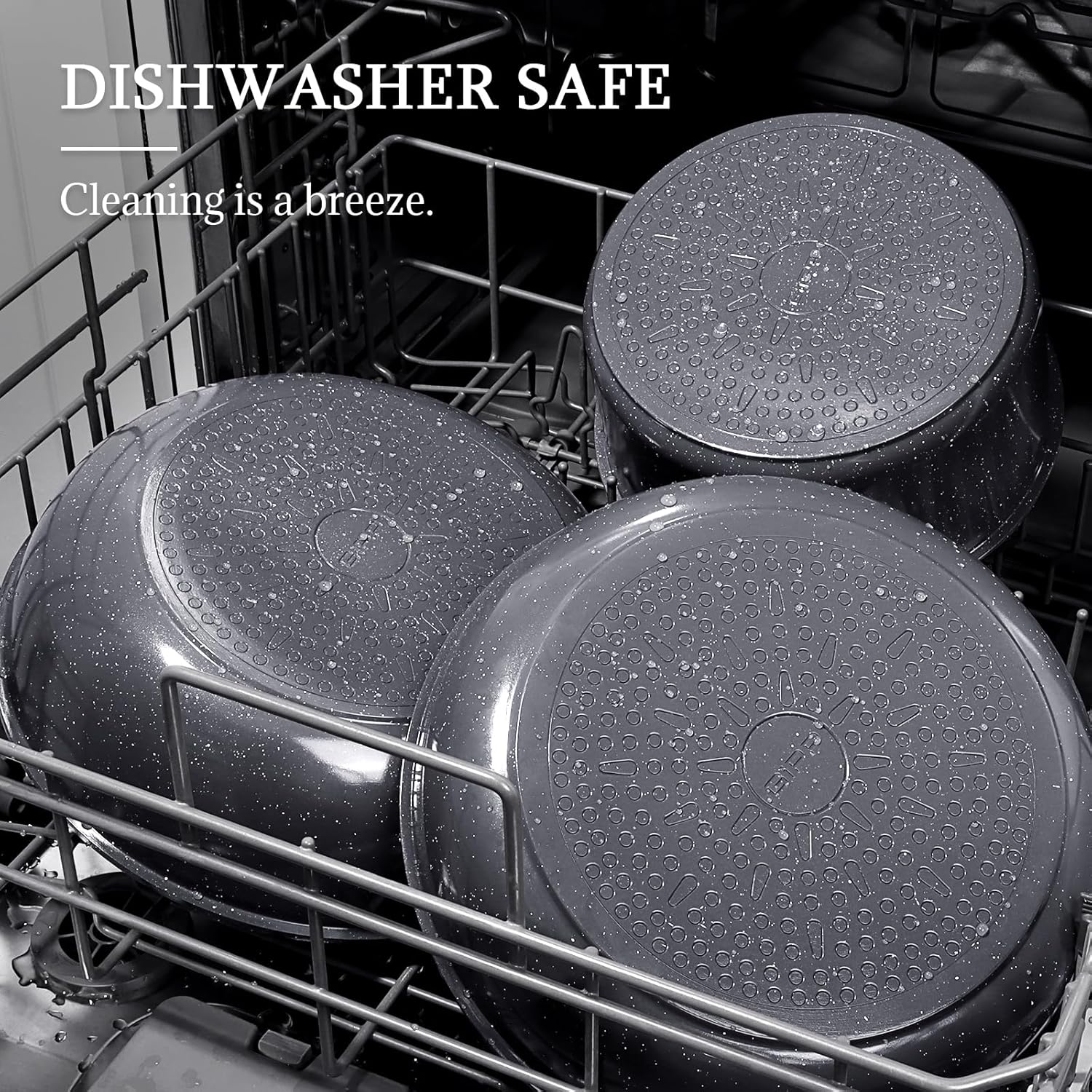 - Compatible with All Cooktops - 3 Piece cookware set is perfect for frying, boiling, sautéing, and more. This pot and pan set features a reinforced die-cast aluminum base that heats up quickly and evenly, works on gas, electric, and induction stovetops