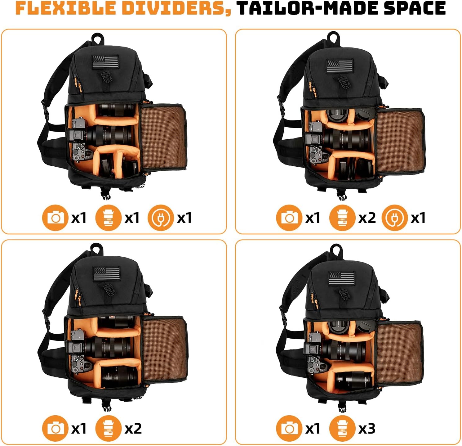 - Customizable Storage: Adjustable dividers and multiple compartments (side tripod pocket, replaceable side pouches) organize cameras, lenses, and accessories efficiently.