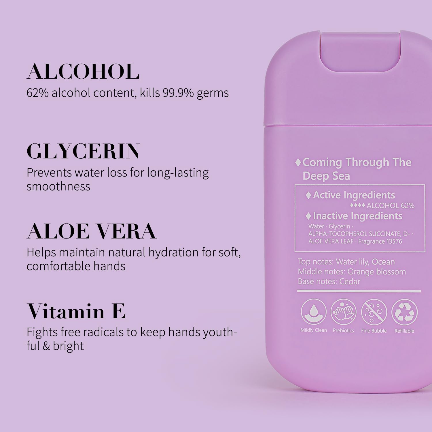 - SKINCARE FOR YOUR HANDS: Refreshing scented liquid hand soap with 62% alcohol content that kills 99.9% of germs, providing effective antibacterial protection while leaving hands softly fragrant. The mist contains hydrating ingredients like glycerin and aloe vera prevents dryness while leaving skin soft and non-sticky. Stay refreshed and germ-free wherever life takes you!
