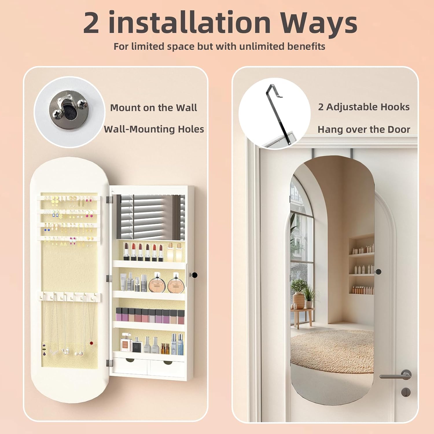 RQZ 8 LEDs Mirror Jewelry Cabinet, Rounded Wide Jewelry Armoire Organizer, Wall or Door Mounted Lockable Jewelry Storage with Interior Mirror, 2 Drawers (43.7" H)