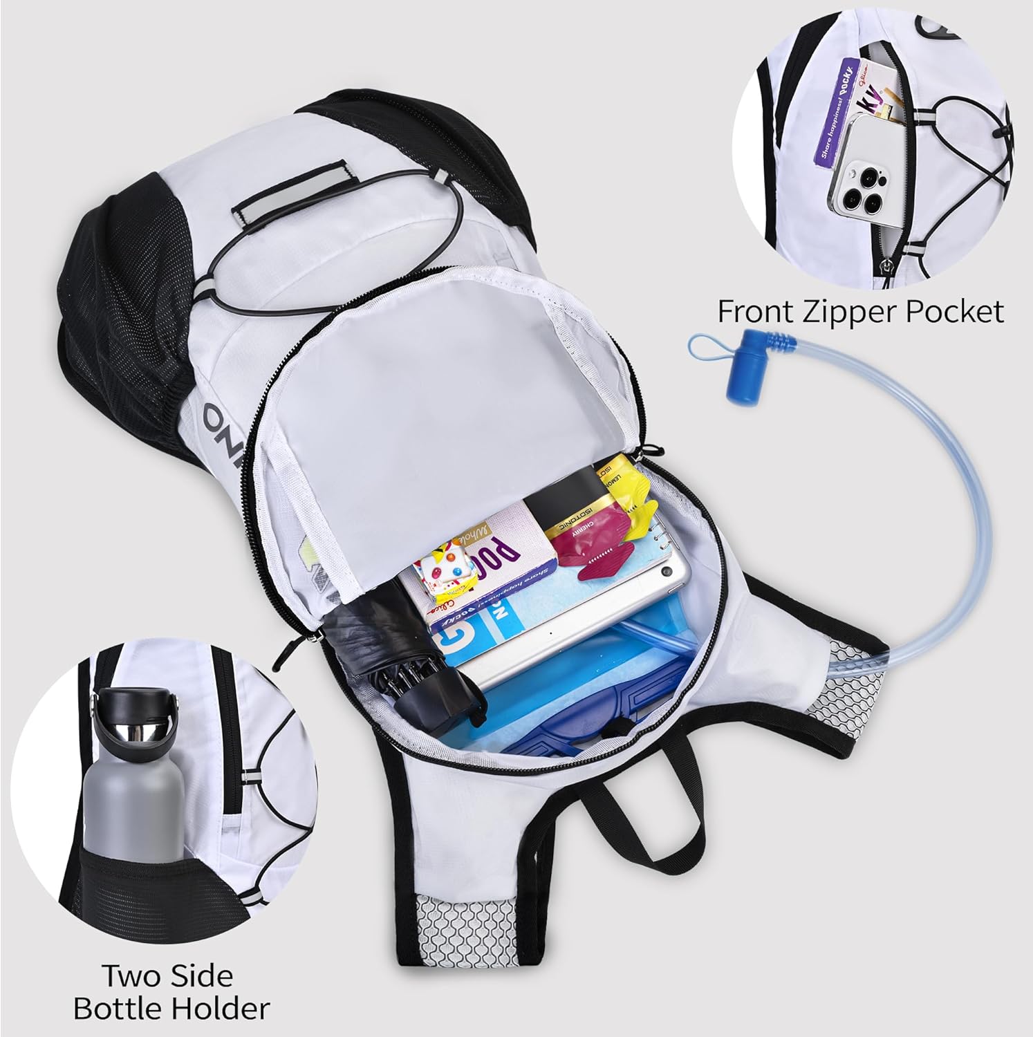 - Thoughtful Storage Details: Running backpack bidirectional main zipper pocket for a water bladder, small storage compartments on front, two small mesh pouches for umbrella, mineral water, BlueTooth stereo, two mesh pouches on the shoulder on phone, and keys