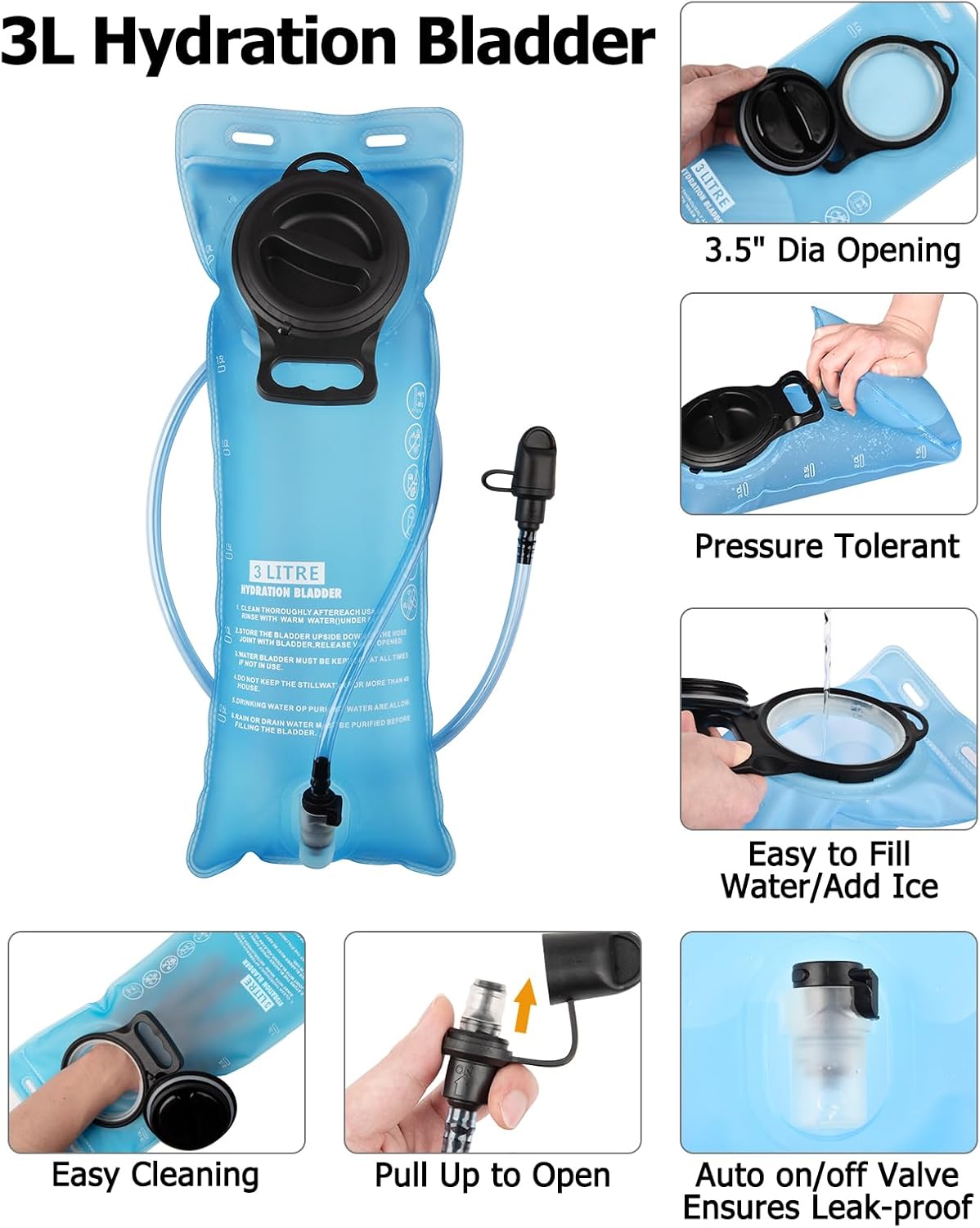 - Professional Leakproof 3L TPU Water Bladder - Our hiking water backpack packs with a 3L large capacity TPU hydration bladder, which is no BPA and odor, and has a 3.5” large open mouth, which is easy to clean and add ice cubes. And 3L large capacity ensures enough water supply for a long day’s exhausted hiking, trekking, biking.