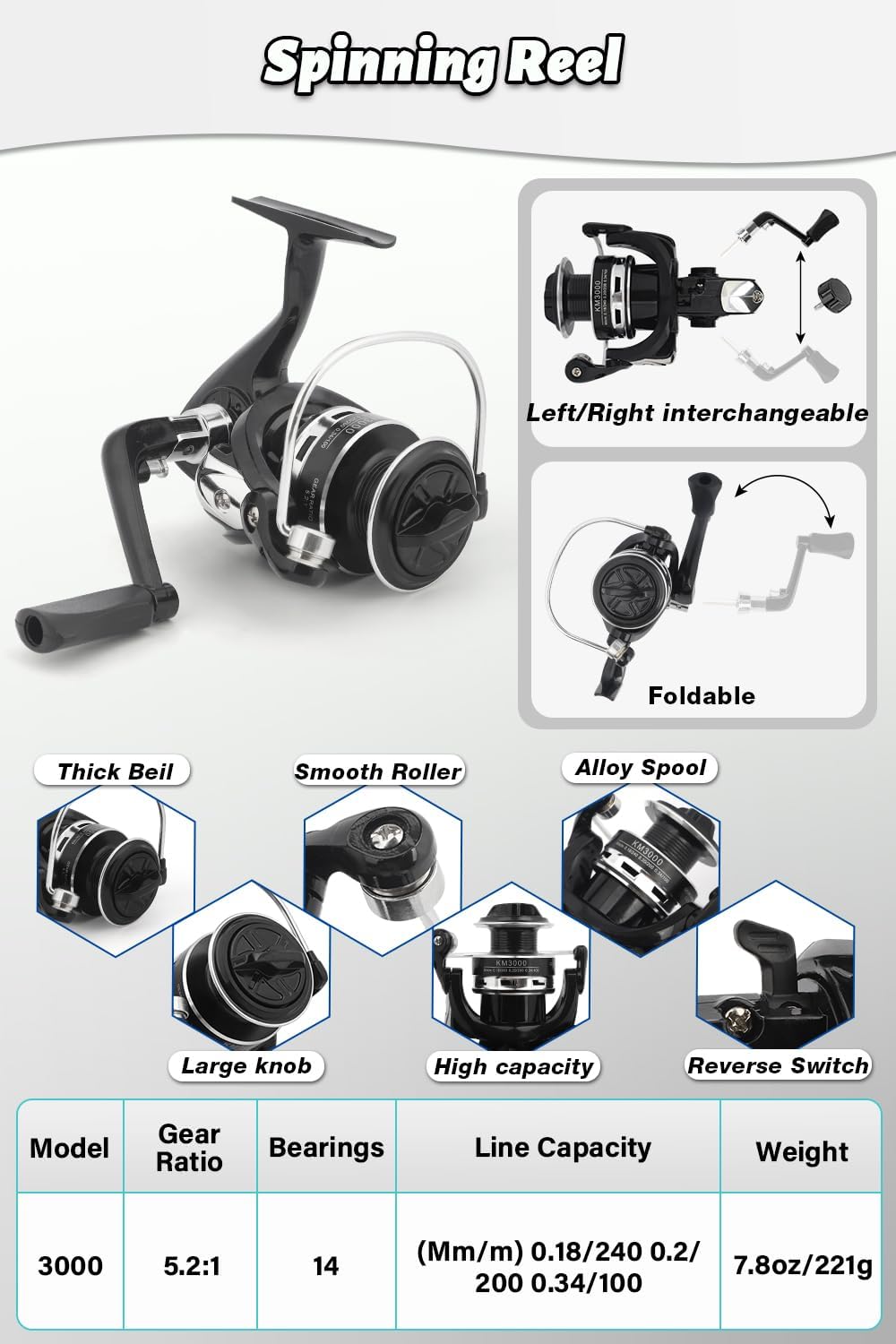 - 🐟【Full set that you can enjoy fishing easily】-Carbon fiber rod +3000 spinning reel + Fishing Pliers + Fish Lip Gripper + Fishing line + Tackle box + Carrier bag, so you can start fishing immediately with this set, there is no need for you to buy any other fishing stuff. Not only for dab hand but also for beginners!