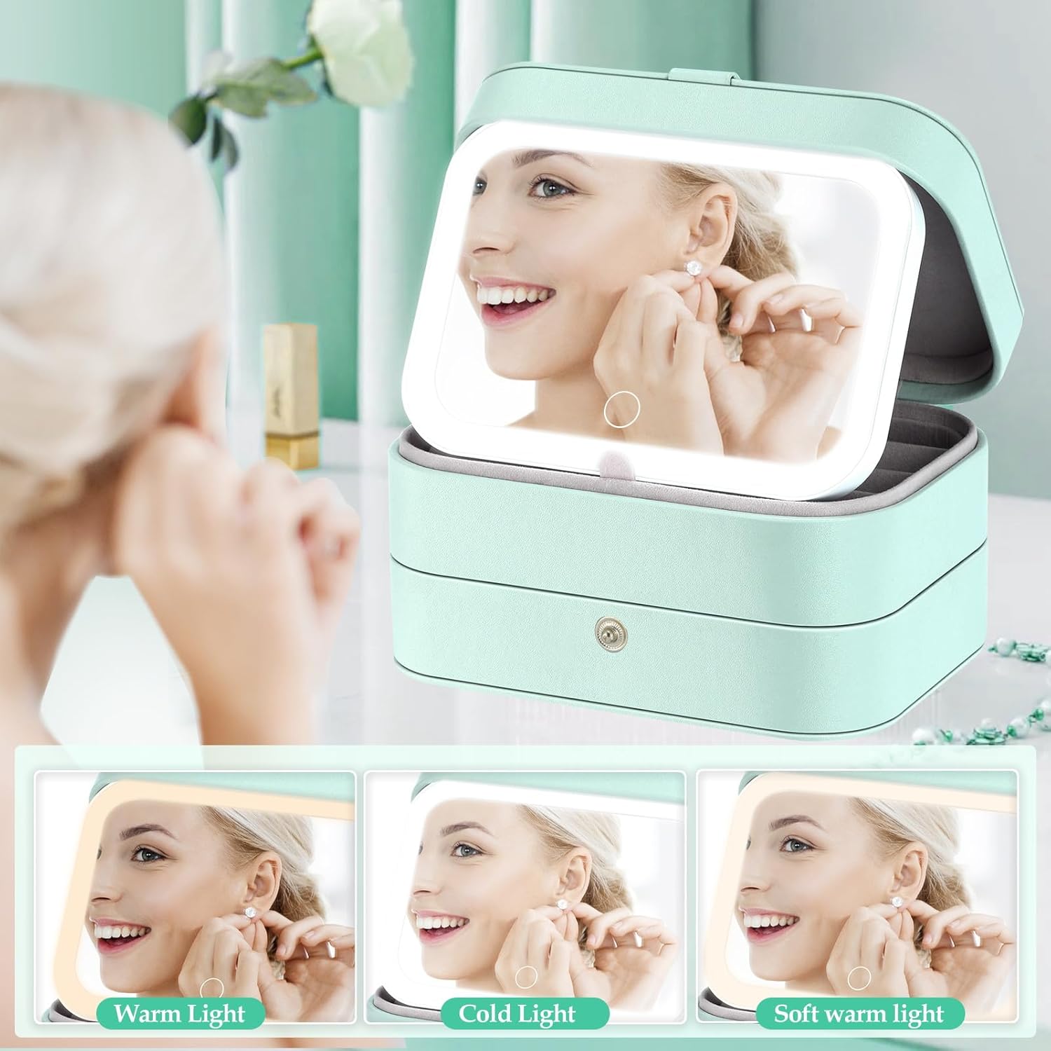 - Adjustable LED Lighting: This travel jewelry case features an integrated LED mirror with three lighting settings - cool, warm, and soft warm (can operate continuously for 40-60 minutes). Whether in a dimly lit hotel room or during your travels, the portable jewelry box's lighting allows you to easily switch between settings to maintain your beautiful makeup