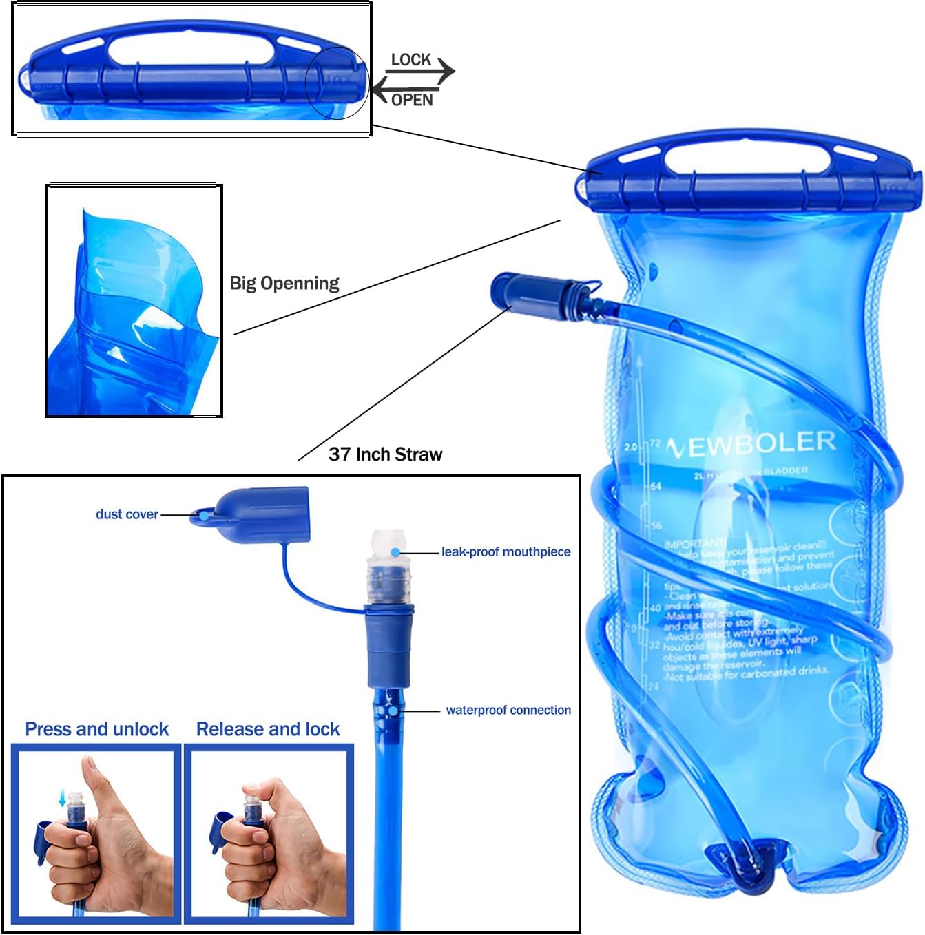 - The hydration backpack comes with a BPA-free 2L water bladder made of food-grade PEVA material. The bite valve locks securely to prevent leaks, ensuring fast water flow without dripping. Ideal for long-distance hiking, climbing, or trail running, this water pack for hiking keeps you hydrated on the go