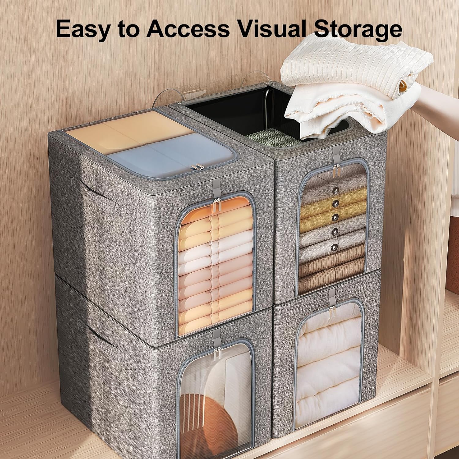 GoMaihe Clothes Storage Bins Metal Frame: 55L Extra Large Stackable Closet Storage Bin with Lid & Clear Window, Heavy Duty Blanket Box for Winter Coats Comforters (Fits Deep Closet 6-Pack)