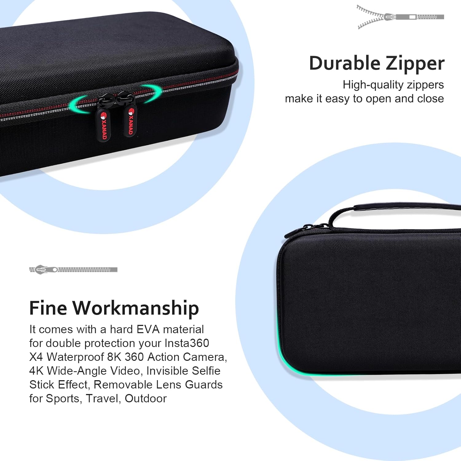 - Easy Access: Designed for ease of use,ensuring quick and convenient operation.The zipper provides safety,keeping the insta360 x5/x4/x3/x2 action camera safely enclosed.Whether you're at home or outside,you can trust that your camera is protected and easily accessible