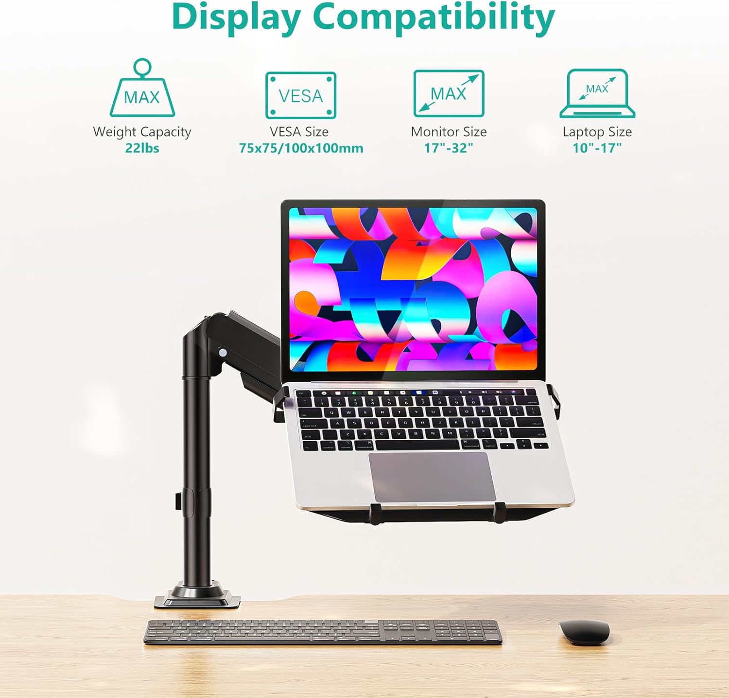 - Compatibility: Fits 10”-15.6” notebooks up to 15.4 lbs and supports 17”-32” monitors weighing up to 22 lbs, providing the ideal solution for both laptops and screens. Dual mounting options for laptop or a monitor with mounting holes 75x75mm and 100x100mm