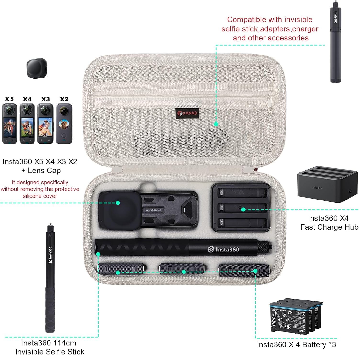 XANAD Hard Case for Insta360 X5/X4/X3/X2 Waterproof 8K 360 Action Camera,114CM Selfie Stick- Stroage Carrying Bag(Cream)