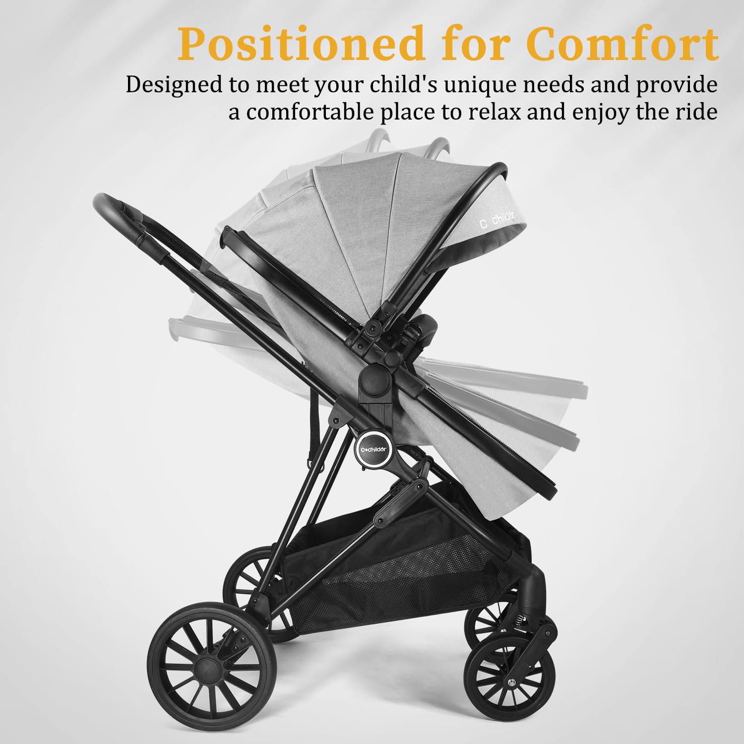 - Grows with Your Baby: 2-in-1 Convertible Stroller. It can be converted in minutes from a lying-down position suitable for babies aged 0–6 months to an upright or semi-reclined position suitable for babies aged 6–36 months. It features an adjustable five-point harness and breathable padding to provide secure, age-appropriate support