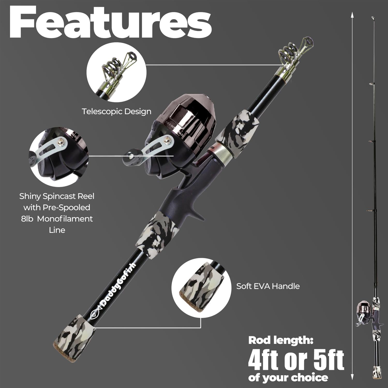 - ALL-IN-ONE KIDS FISHING SET - The kit includes a portable telescopic rod & pre-spooled (8lb test line) reel combo, carry bag, bait net and loaded tackle box.