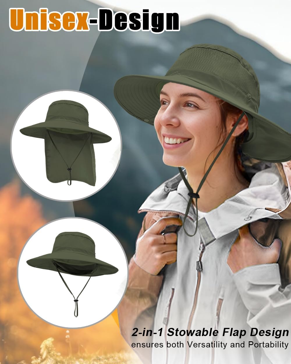 - 【Light Wight & Stowable Neck Flap】- Our fishing hat can be folded in half and fit into any backpack or bag. light-weight and convenient to carry it everywhere you go.The long neck flap protect your neck from sunburn and the neck flap can be stowable as a bucket hat.