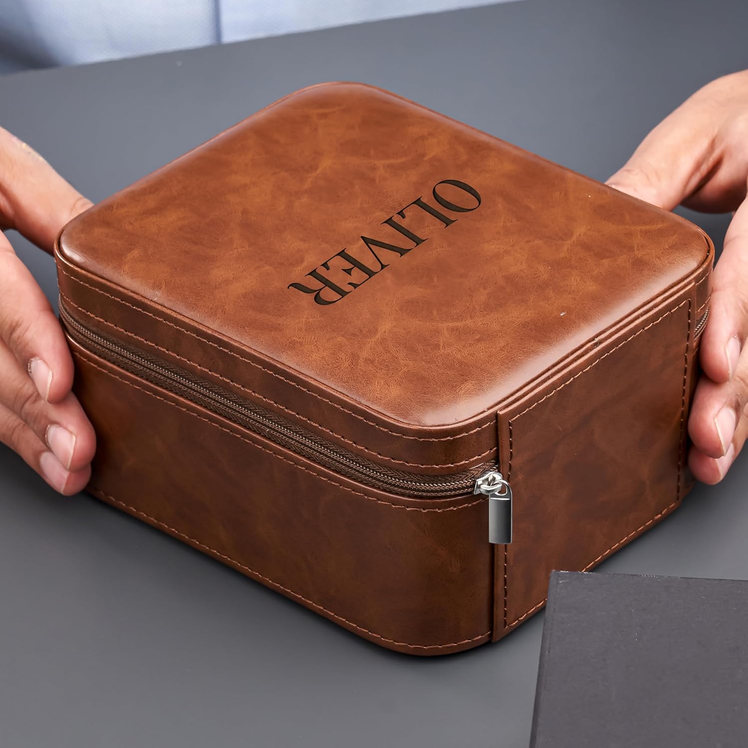 Awesometik Luxury Travel PU Leather Watch Case. Watch Storage Organizer. Watch Display & Watch Holder. Perfect For Watch Collection. Ready to Gift for Men (Brown/Brown, Engraved 2 Slot Watch Case)
