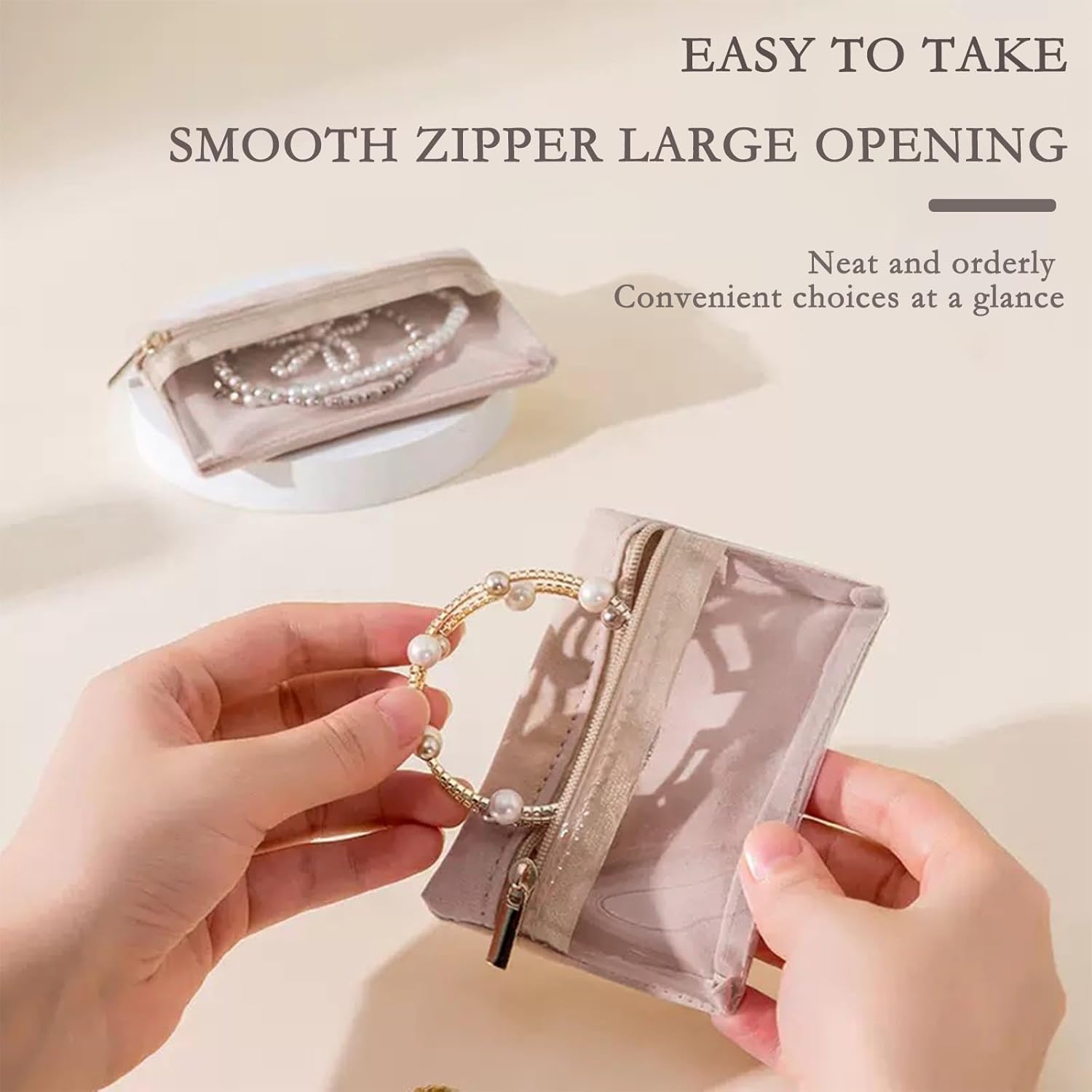 - 8 Velvet Clear Bags:The travel jewelry case features 8 velvet-lined zippered pouches (10*8cm) to securely store rings, earrings, necklaces, and bracelets.fPlush fabric prevents tangling and scratching, with dual-layer protection from inner+outer zippers