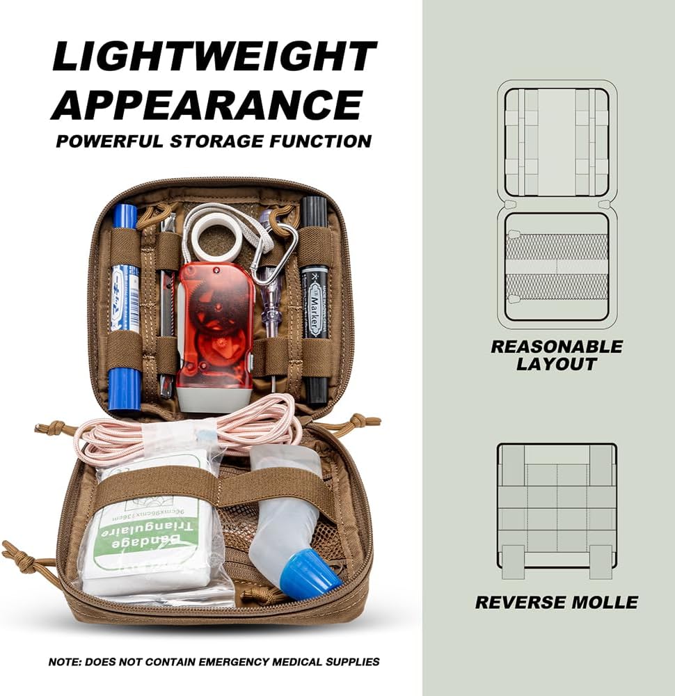 - Stay organized with versatile storage options including a separate front zipper pocket, Adhesive surface, mesh pocket, and elastic loops, perfect for efficiently storing EDC items, first aid supplies, pens, or tools