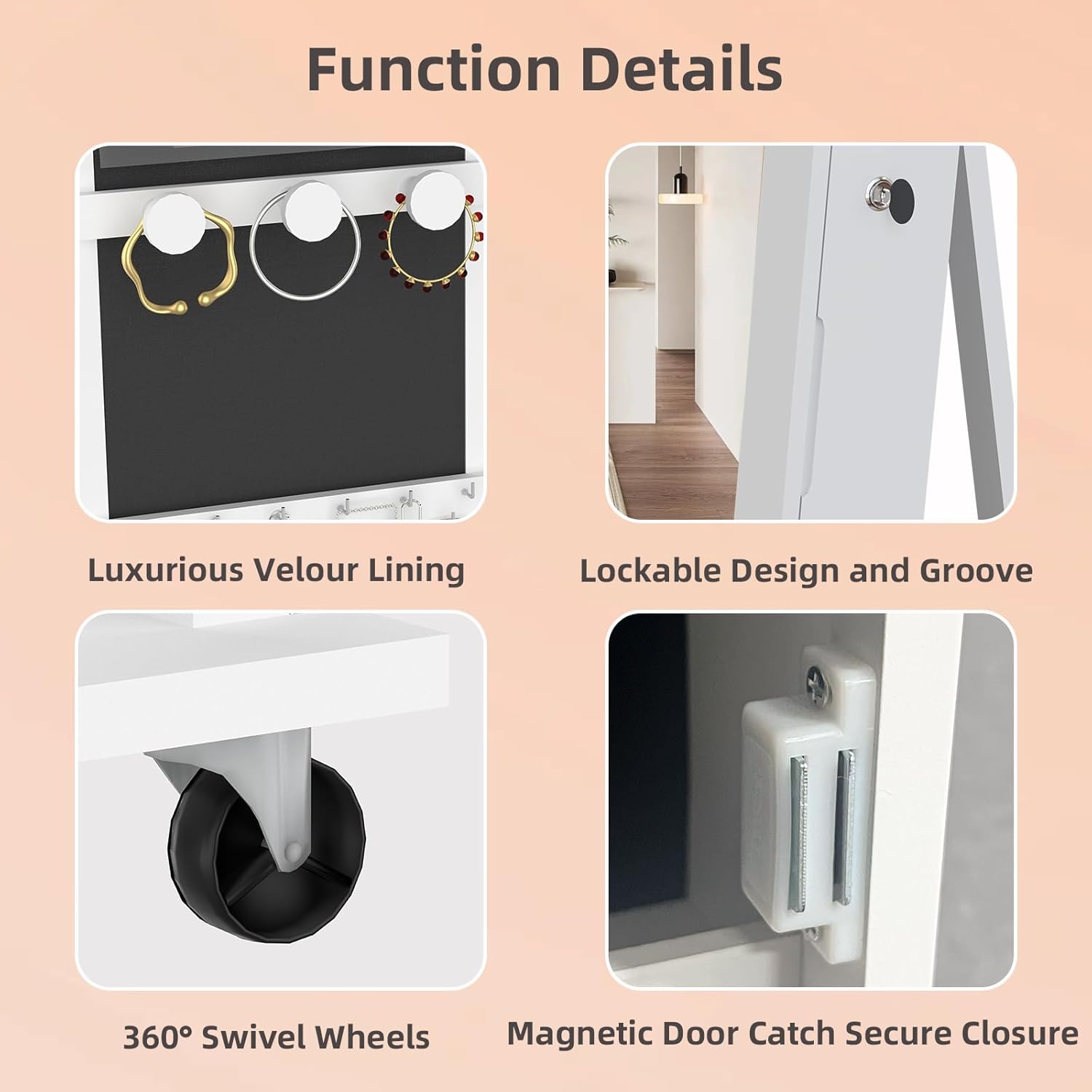 - Easy Mobility and Stability:With four rolling wheels equipped with brakes, this elegant jewelry armoire is designed for easy movement throughout your home. The sturdy construction ensures stability while providing a functional storage solution for your beauty essentials.