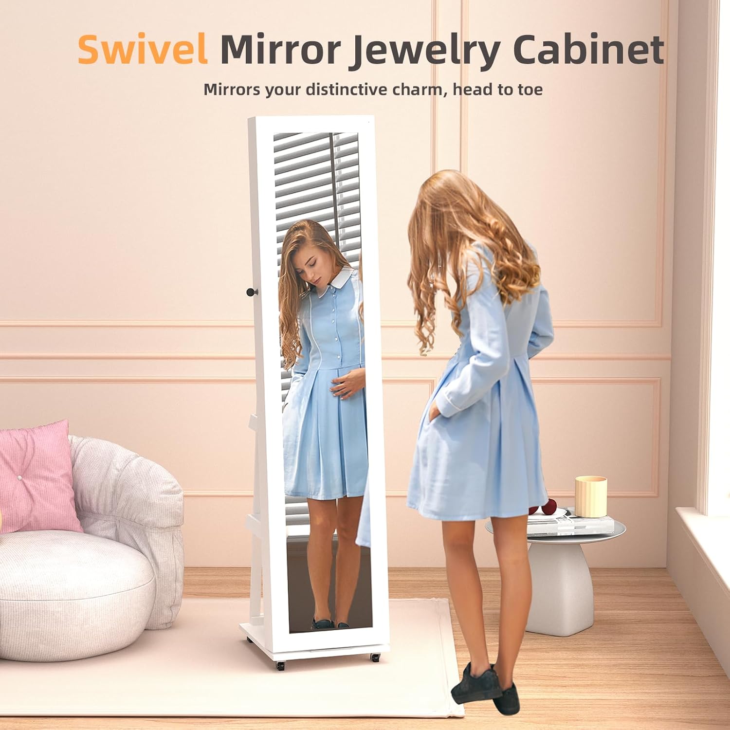 RQZ 360° Rotating Jewelry Organizer with Lights, 8 LEDs Jewelry Cabinet Armoire Standing, Lockable Jewelry Storage with Full-Length Mirror, 4 Storage Shelves, Interior Mirror(65.35" H)
