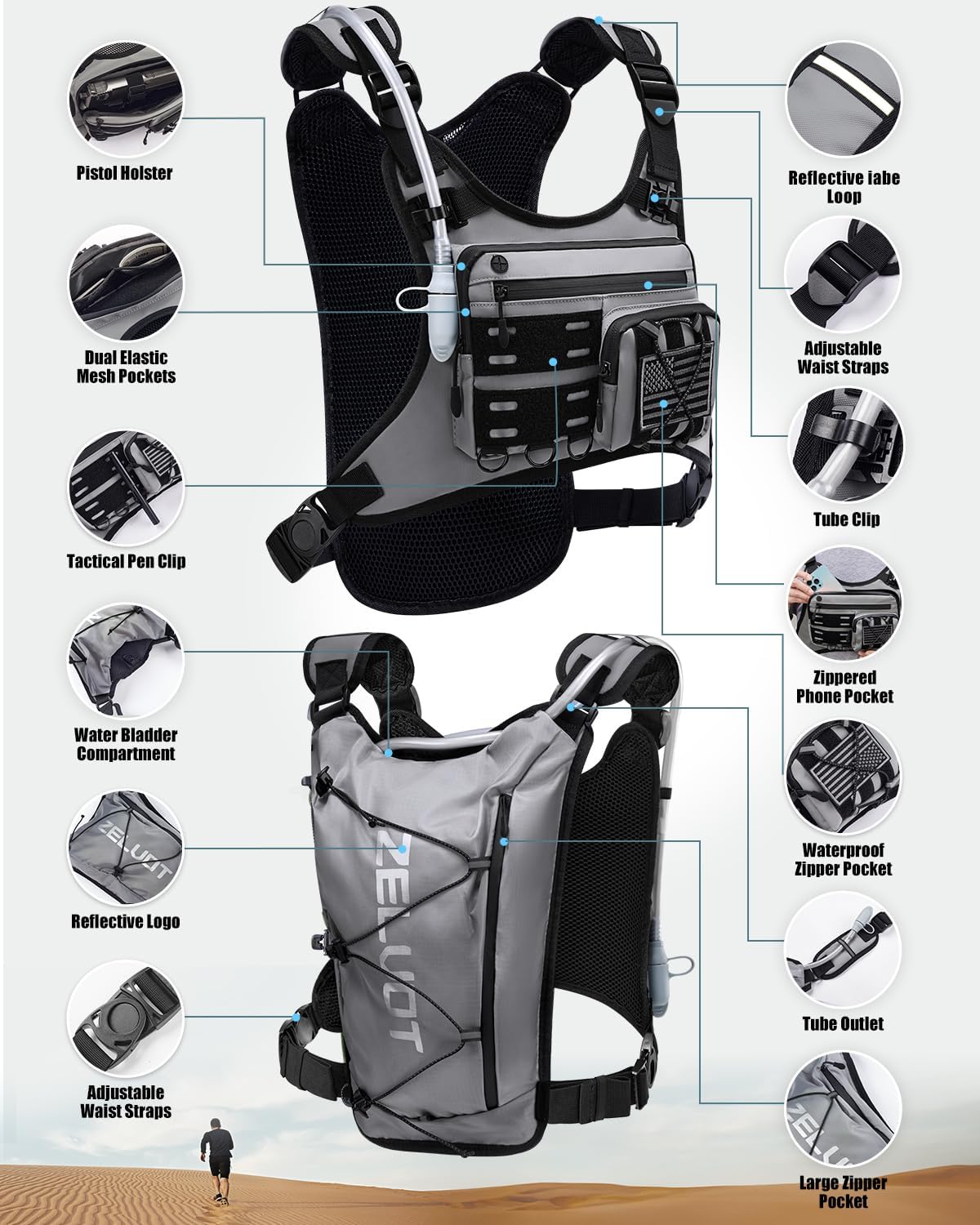 - Adjustable Shoulder Straps & Waist Belt - The Zelvot running backpack is designed for optimal comfort, featuring widened adjustable shoulder straps to distribute weight evenly and reduce strain. The adjustable waist belt minimizes bounce and shifting, preventing chafing from an improper fit. The chest adjustability range of this running vest for women or men: 29"- 41", making it adaptable to different body types.