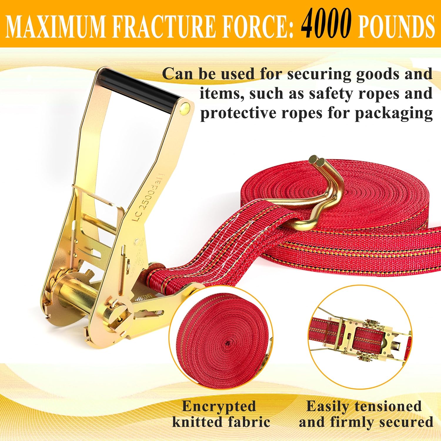 - High-Quality Ratchet Straps: These heavy duty ratchet straps are made of high-density propylene fiber and paired with all-steel heat-treated metal ratchets and hooks; The widened 2-inch strap is resistant to breaking and can withstand a pulling force of up to 4000 pounds. During transportation, even when encountering bumps and vibrations, the cargo straps ratcheting can firmly lock the goods, thereby greatly reducing the risk of slipping and shifting, and ensuring transportation safety