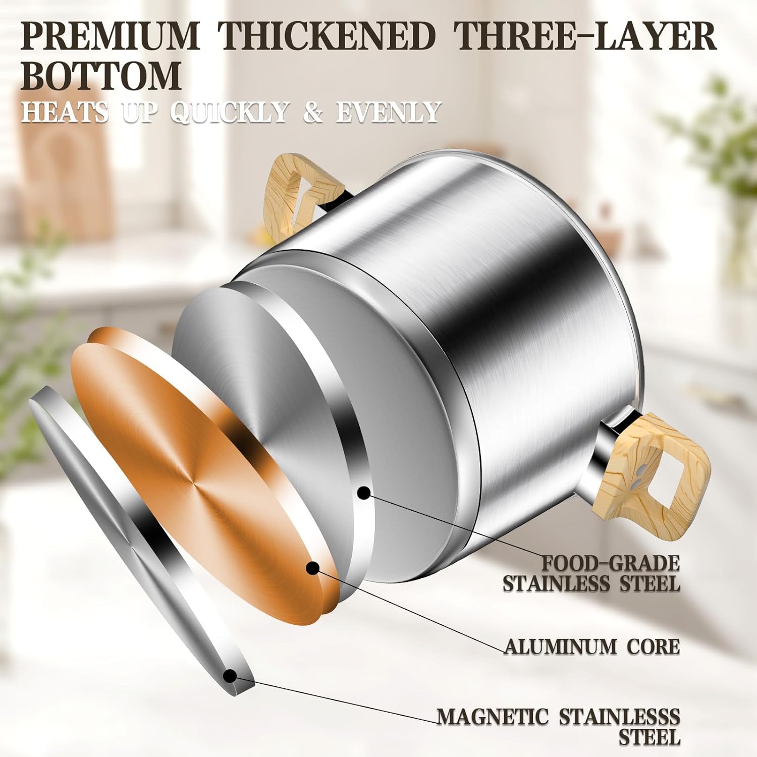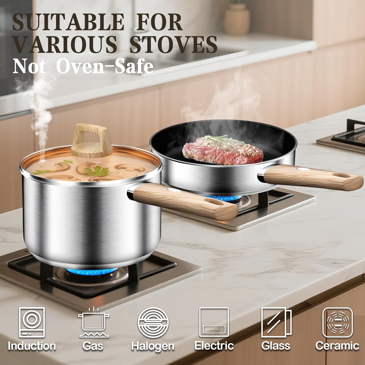 - [Even Heating & Multi-Hob Compatibility] The triple-layer thick base with aluminum core delivers fast preheating. Eliminates hot spots while saving energy. Perfect for searing, simmering, boiling, and sautéing. Suitable for various stovetop types including induction, gas, electric, and ceramic. Note: Due to the wooden handles, this cookware set is not suitable for oven use.