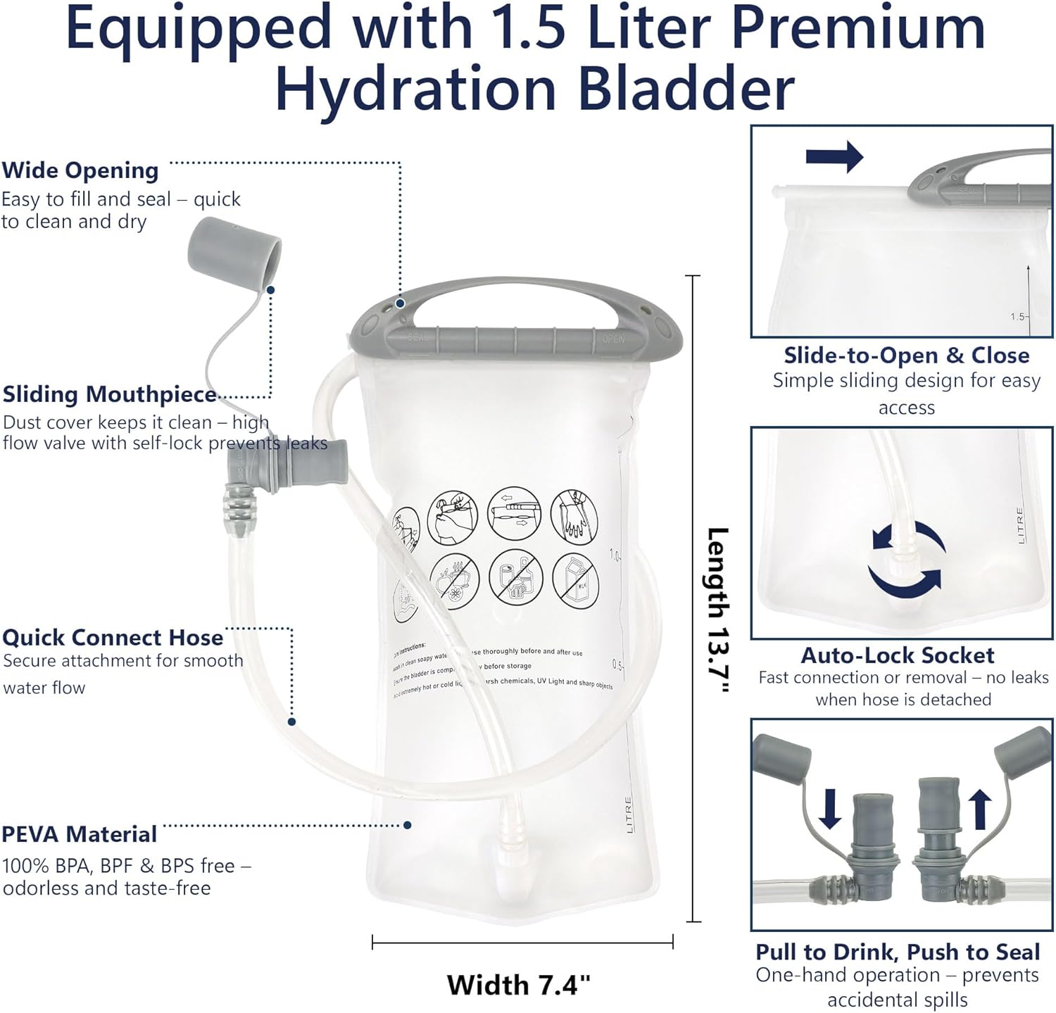 - 💧 1.5L Bladder Compatible with Smart Storage: Features a zippered main compartment with dual internal dividers—one for the included 1.5L water bladder and one for gear like energy gels or a windbreaker
