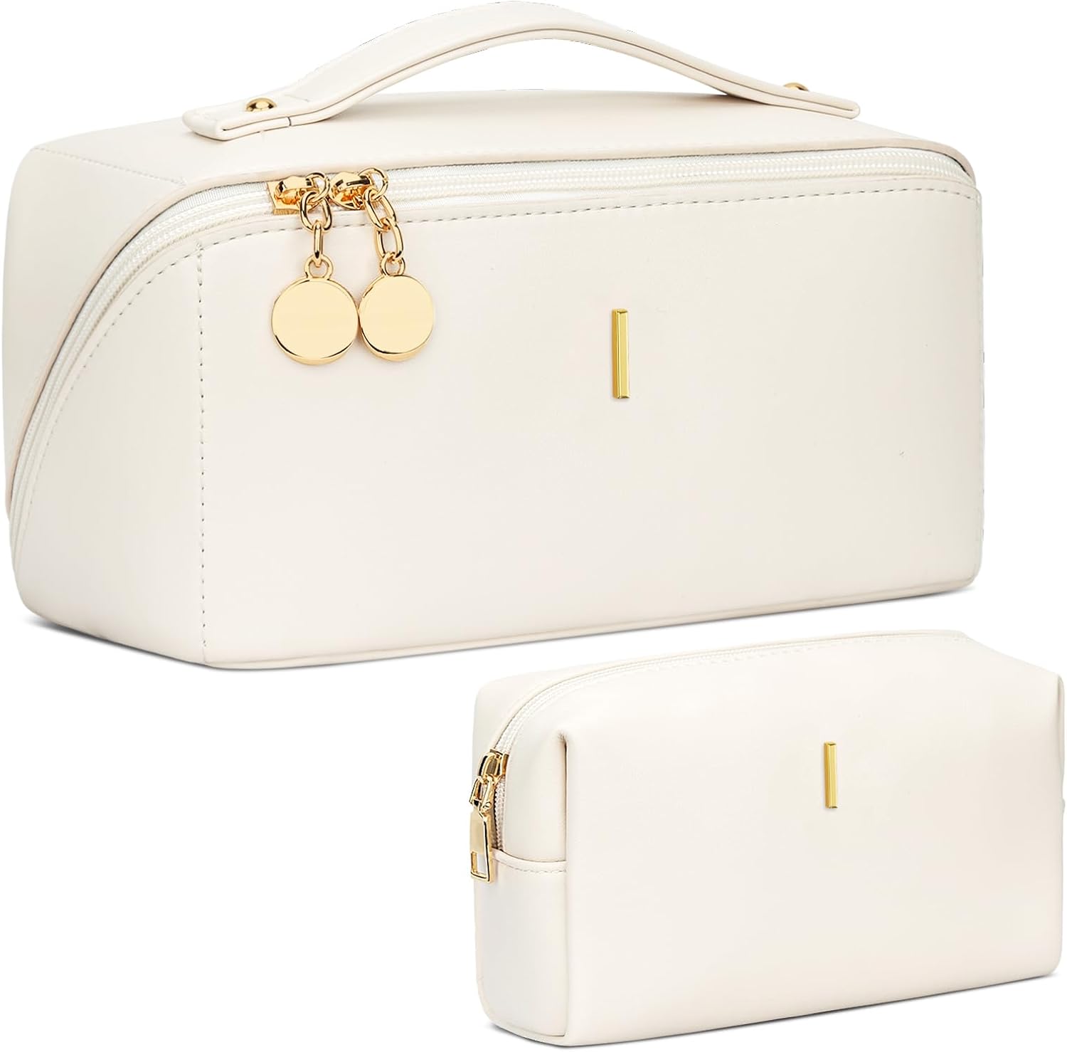Birthday Gifts for Women Teen Girl, Personalized Initial Makeup Organizer Bag Set, Open Flat Travel Cosmetic Bag With Clear Divider and Handle(Beige,I)