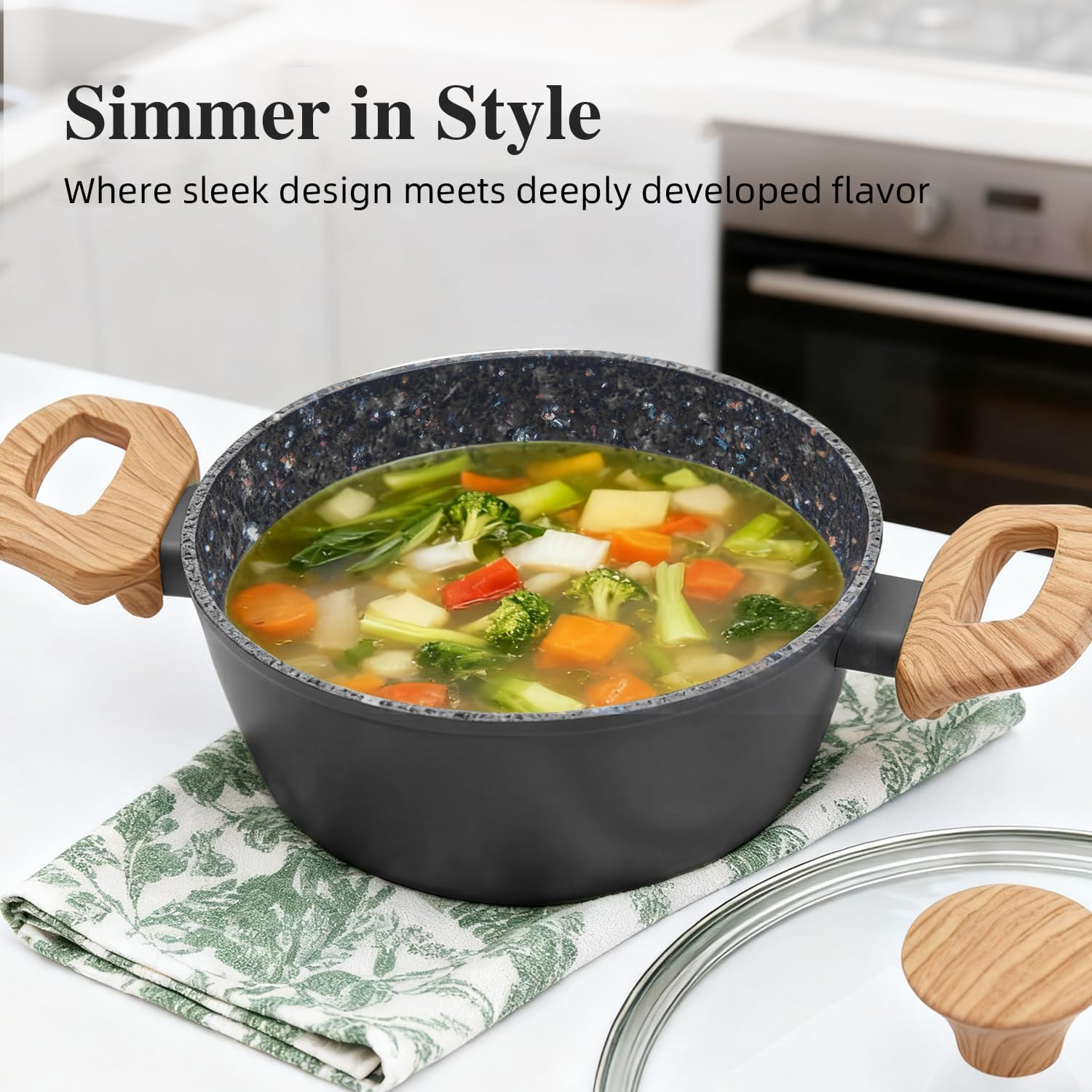 - 【Thoughtful, User-Friendly Design】Features secure-fitting lids to lock in flavor and moisture, and ergonomic wood-grain handles that provide a comfortable, non-slip grip. This set is engineered for comfort and control during all your culinary creations.