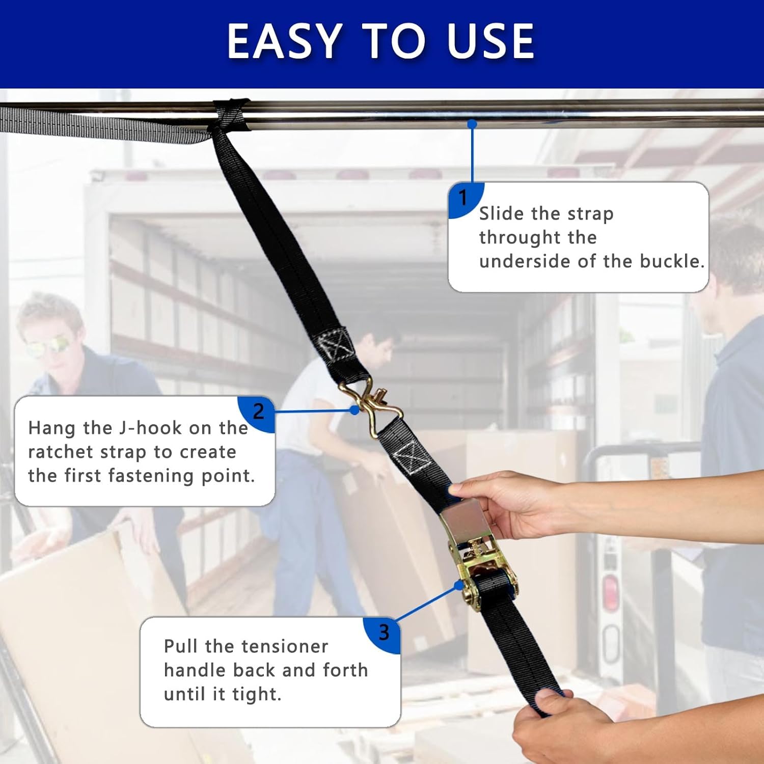 - DIMENSIONS & PACKAGES: Tie Down Straps are 1"(wide)x 16.4'(long) size. Package include: 4x Durable ratchet straps with 4 metal ratchet buckles, 1x Work Gloves