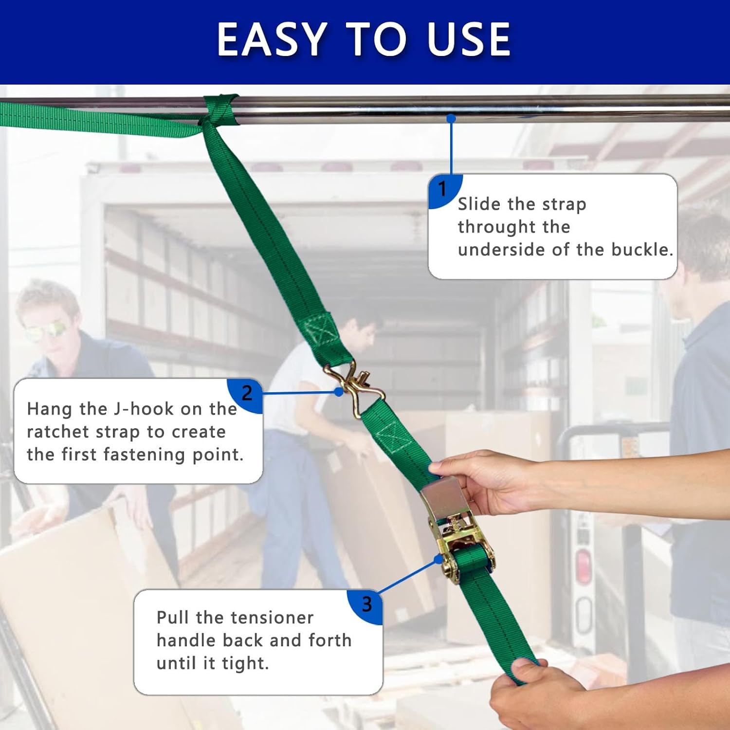 - DIMENSIONS & PACKAGES: Tie Down Straps are 1"(wide)x 16.4'(long) size. Package include: 4x Durable ratchet straps with 4 metal ratchet buckles, 1x Work Gloves