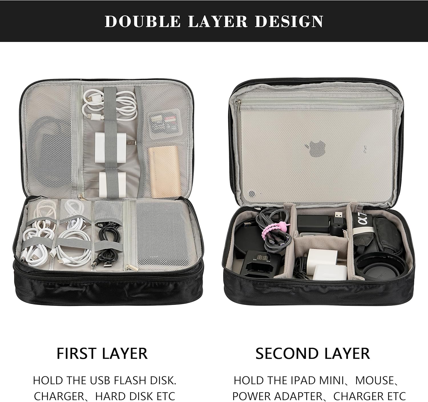 - 1️⃣ LARGE CAPACITY & DOUBLE LAYER DESIGN This electronics organizer features dual-layer compartments that offer ample storage for cables, USB drives, chargers, power banks, adapters, and more. The upper mesh pockets keep cords tangle-free, while the bottom padded dividers fit larger items like tablets or hard drives — keeping everything neat and accessible.