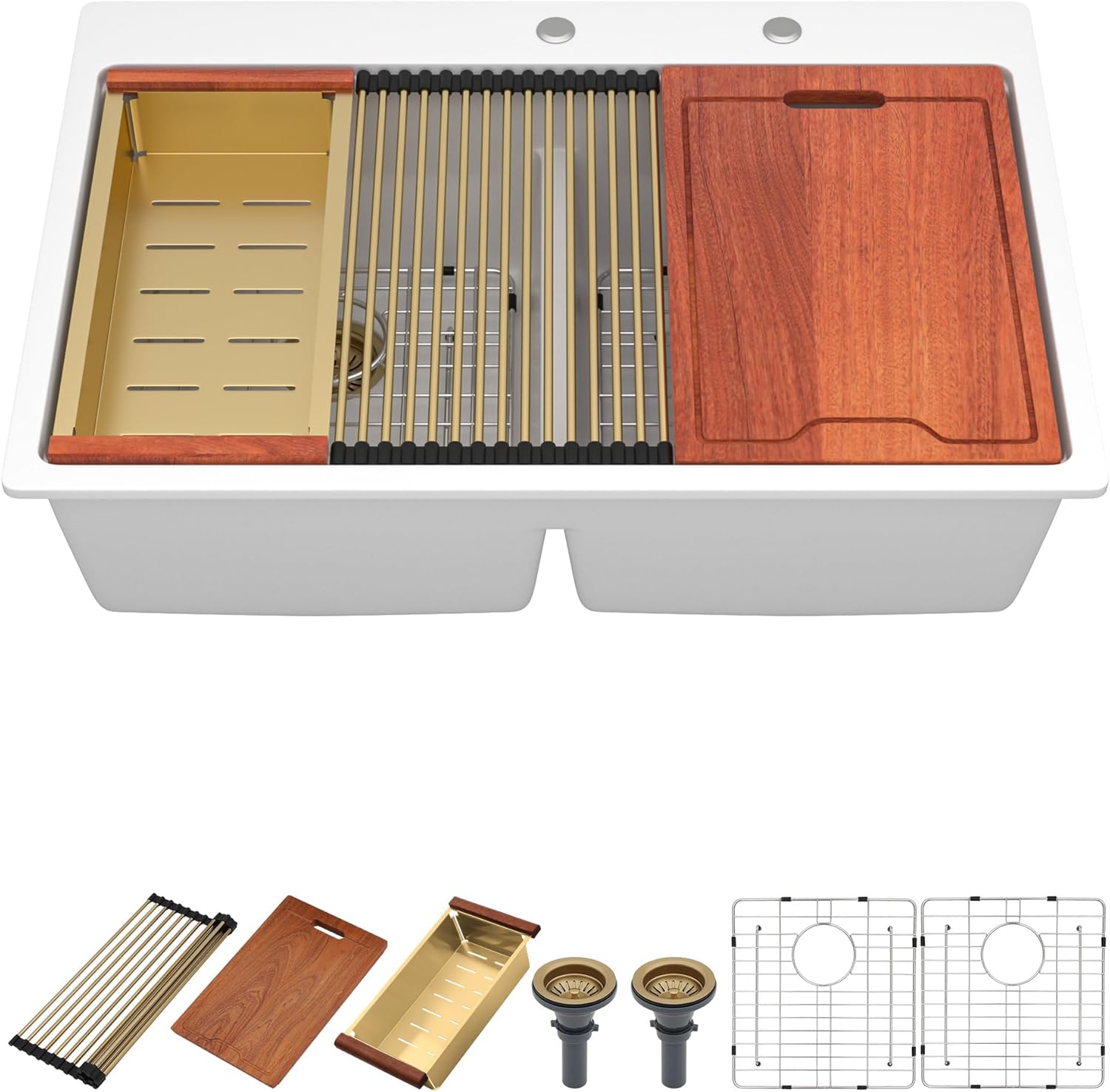 - Premium Granite Composite: Crafted from quartz, this 33 Inch Quartz Drop In White Kitchen Sink with gold offers superior scratch, stain, and heat resistance for lasting performance. The quartz make it Hard and Durable