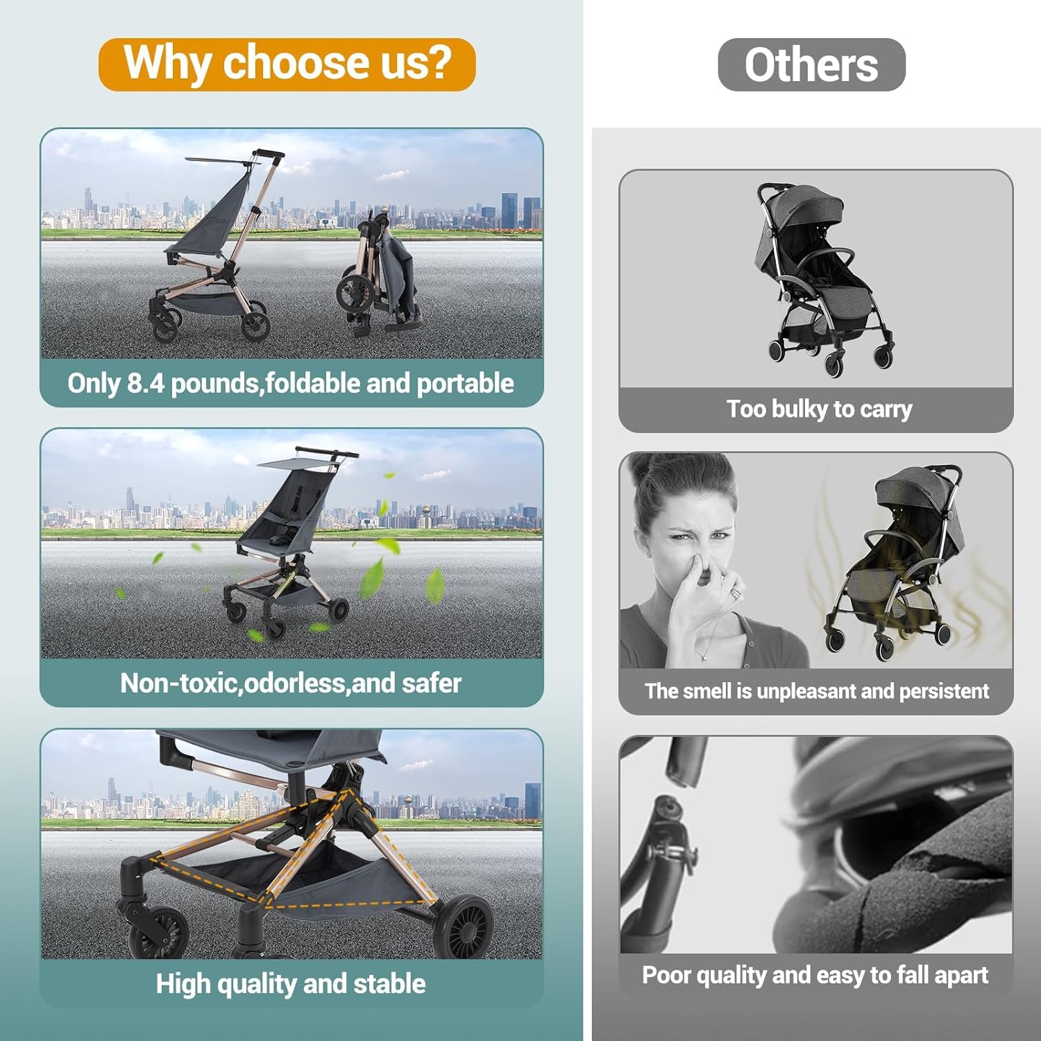 - 【Lightweight & Portable Design】Lightweight stroller only 8.4 lbs,this stroller is made from durable alloy and folds to D:18.5” * L:17.7” * H:19.3”.It fits in airplane compartments and includes a travel bag for effortless,compact transport anywhere you go.